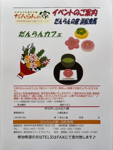 ご利用者様へのレクリエーションを兼ねて、ケアマネージャー様等と相談できる機会としてだんらんカフェを毎月開催しています。だんらんの家ご利用のご相談をしてみませんか?
