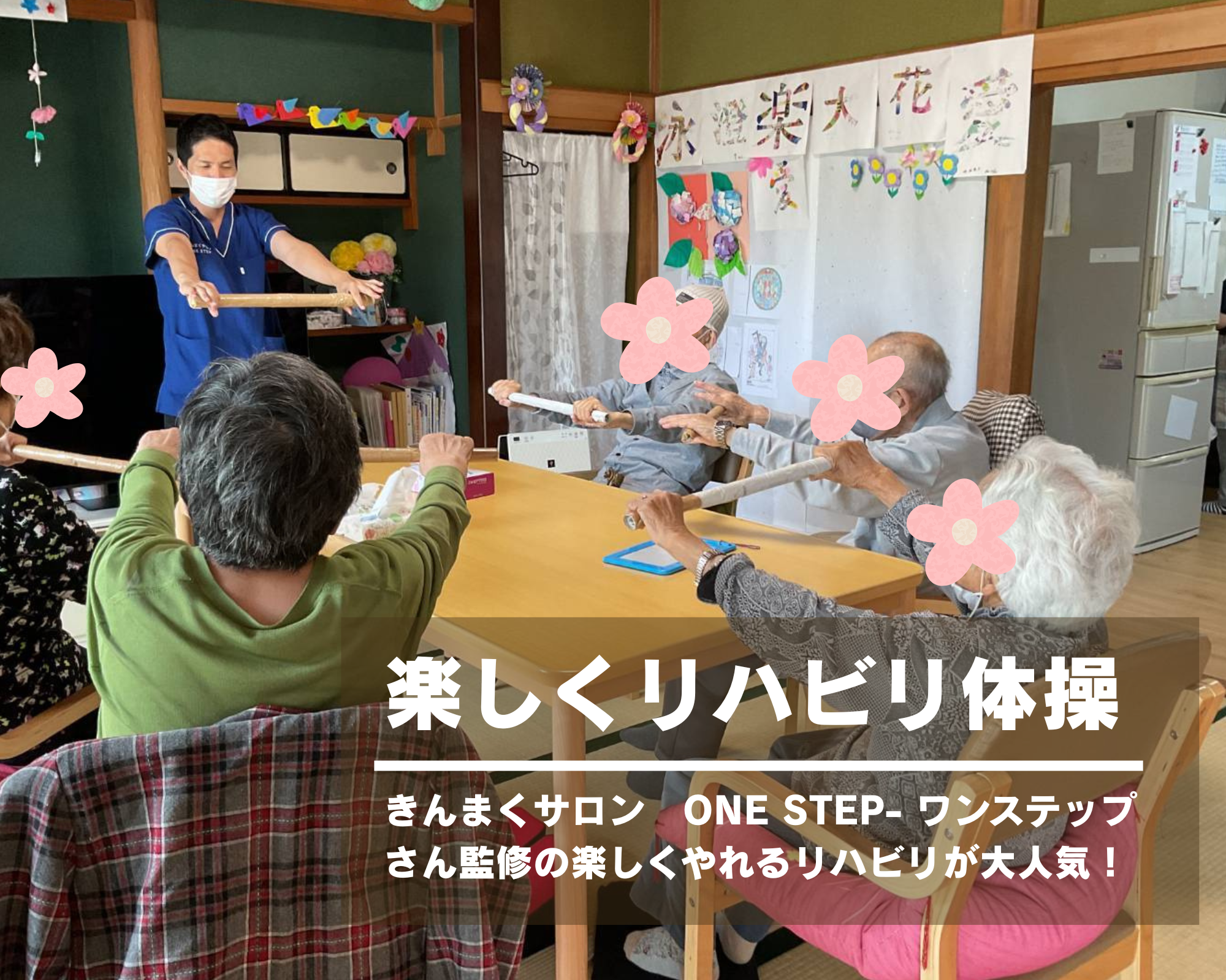曳馬の人気店。きんまくサロンONE STEPーワンステップの上原先生の監修の元、みんなで楽しくできるリハビリ体操を実施しています。毎回とても好評でリハビリ体操目的で来るご利用者様もたくさんいらっしゃいます。浜松市のだんらんの家浜松曳馬では10人定員の小規模デイサービスながら充実したリハビリを受けることが可能です。