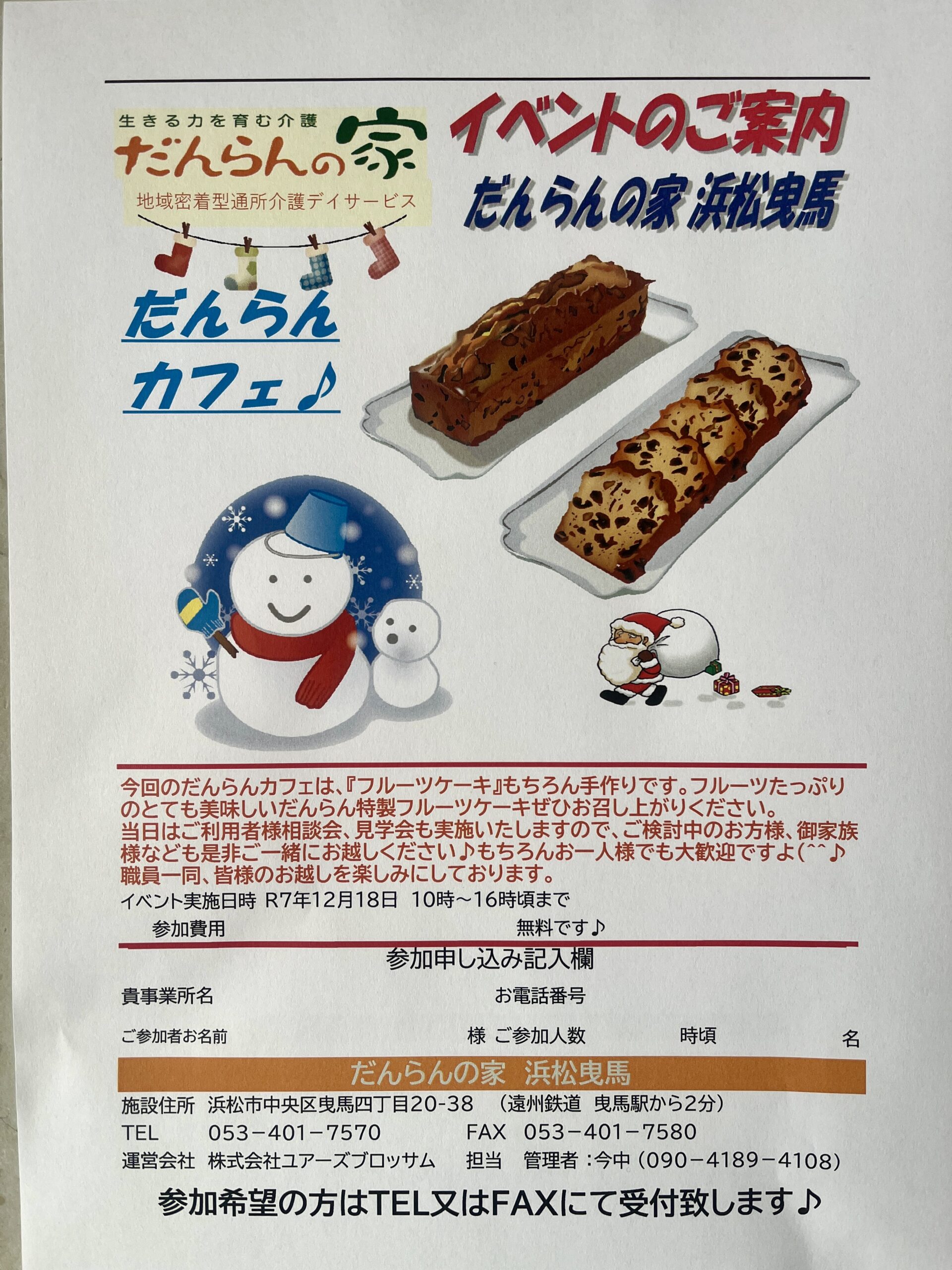 ご利用者様へのレクリエーションを兼ねて、ケアマネージャー様等と相談できる機会としてだんらんカフェを毎月開催しています。だんらんの家ご利用のご相談をしてみませんか?