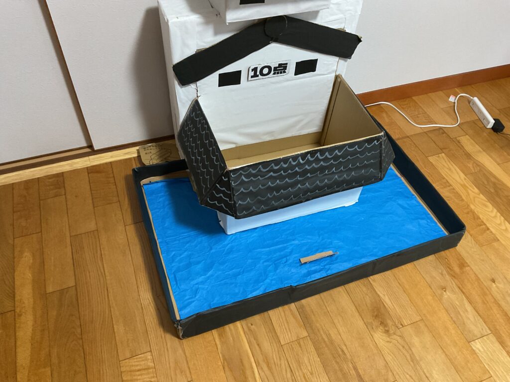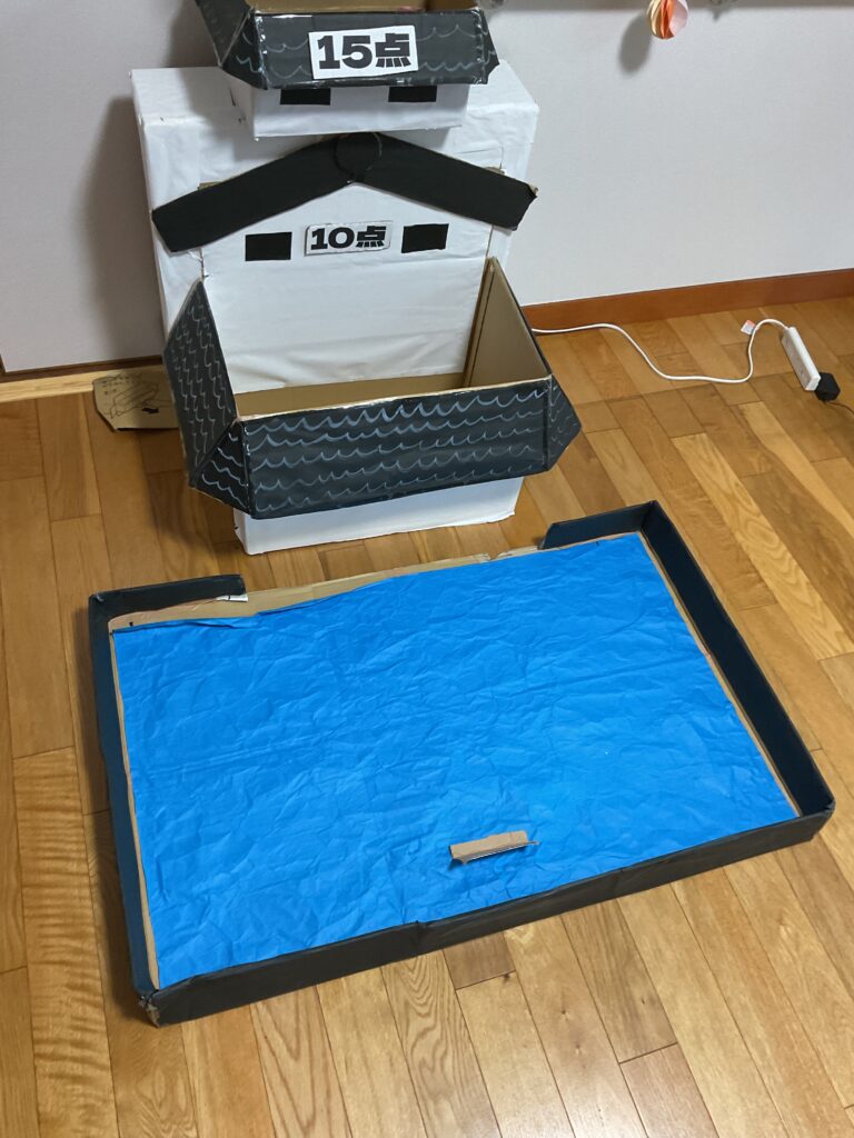 ボールを投げて箱の中に入れ点数を競うゲームです。