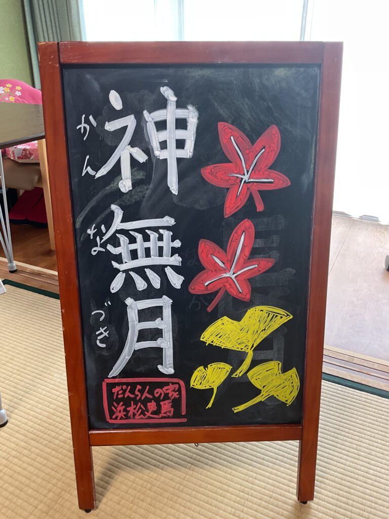 玄関前に置くブラックボードも10月をテーマに描きました。