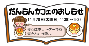 次回は11月20日(木)にホットケーキ作りをする予定です。