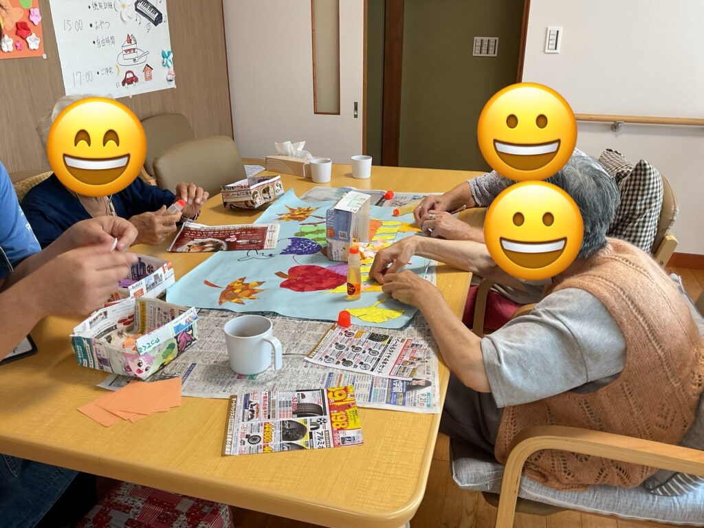 今日のレクは窓に貼る、貼り絵作りをしました。 職員と一緒に和気あいあいと作業を... -